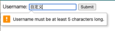 setCustomValidity方法来自定义错误消息。<!DOCTYPE html> <html lang="en"> <head> <meta charset="UTF-8" /> <meta name="viewport" content="width=device-width, initial-scale=1.0" /> <title>自定义 Validation</title> </head> <body> <form id="myForm"> <label for="username">Username:</label> <input type="text" id="username" name="username" required /> <button type="submit">Submit</button> </form> <script> // 监听用户名输入事件 document .getElementById('username') .addEventListener('input', function () { // 检查输入的用户名是否至少为5个字符 if (this.value.length < 5) { this.setCustomValidity( 'Username must be at least 5 characters long.' ) } else { this.setCustomValidity('') // 清除自定义错误消息 } }) // 监听表单提交事件 document .getElementById('myForm') .addEventListener('submit', function (event) { const usernameInput = document.getElementById('username') // 使用 checkValidity 方法检查用户名字段的有效性 if (!usernameInput.checkValidity()) { event.preventDefault() // 阻止表单提交,并显示自定义的错误消息。 } }) </script> </body> </html>